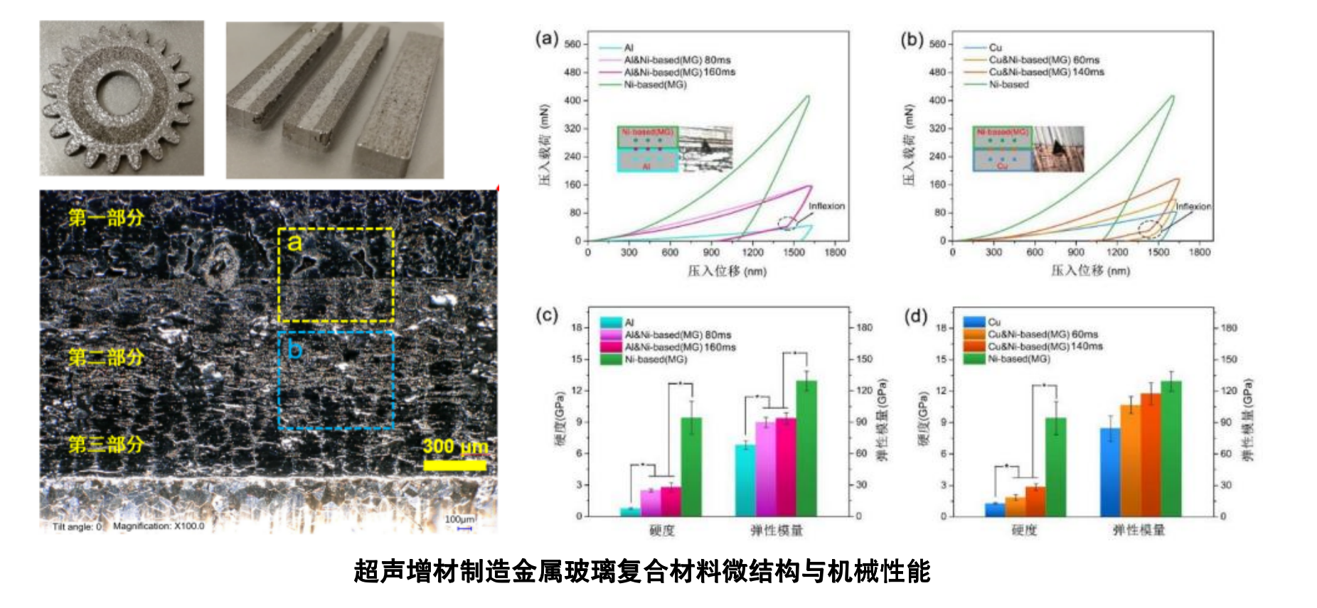 揭示了超聲與選區(qū)激光熔化增材制造成形金屬玻璃的組織演變及強(qiáng)化機(jī)理;提出了金屬玻璃及其與晶態(tài)金屬復(fù)合材料仿生剛?cè)狁詈辖Y(jié)構(gòu)零件超聲增材制造方法,探究了晶態(tài)金屬仿貝殼、蜂窩等結(jié)構(gòu)超聲增材制造成形,實(shí)現(xiàn)了高非晶率金屬玻璃可控制備。