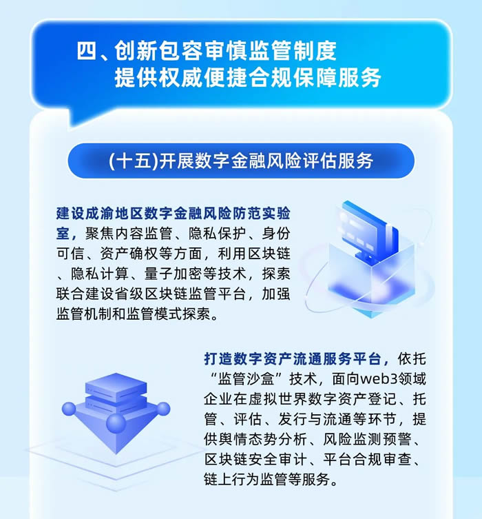 第一,開展數字金融風險評估服務,建設成渝地區數字金融風險防范實驗室,探索聯合建設省級區塊鏈監管平臺,打造數字資產流通服務平臺。