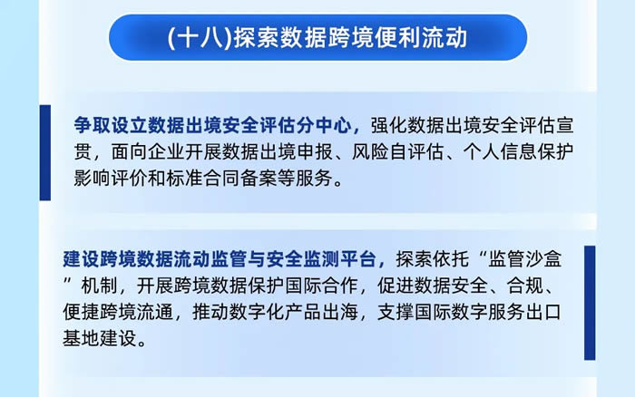 第四,探索數據跨境便利流動,爭取設立數據出境安全評估分中心,建設跨境數據流動監管與安全監測平臺。