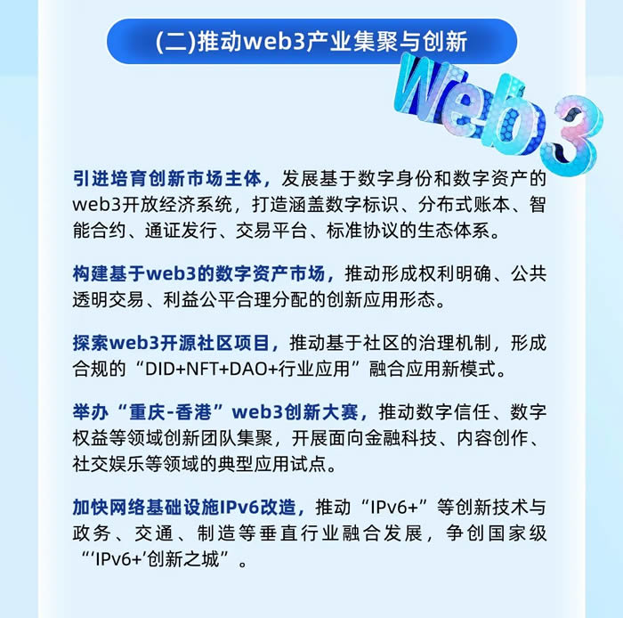 將引進培育創新市場主體,構建基于web3的數字資產市場,探索web3開源社區項目,舉辦“重慶-香港”web3創新大賽,加快網絡基礎設施IPv6改造。