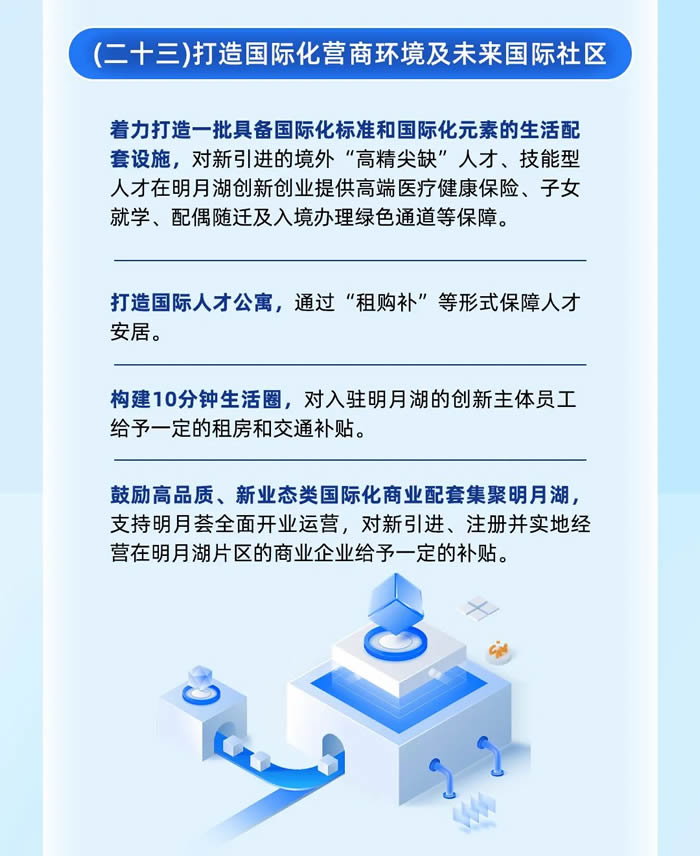 將著力打造一批具備國際化標準和國際化元素的生活配套設施,打造國際人才公寓,構建10分鐘生活圈,鼓勵高品質、新業態類國際化商業配套集聚明月湖。