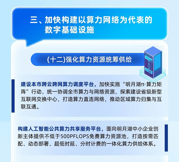 明月湖還將加快構建以算力網絡為代表的數字基礎設施,包括強化算力資源統籌供給,建設本市跨云跨網算力調度平臺,構建人工智能公共算力共享服務平臺。