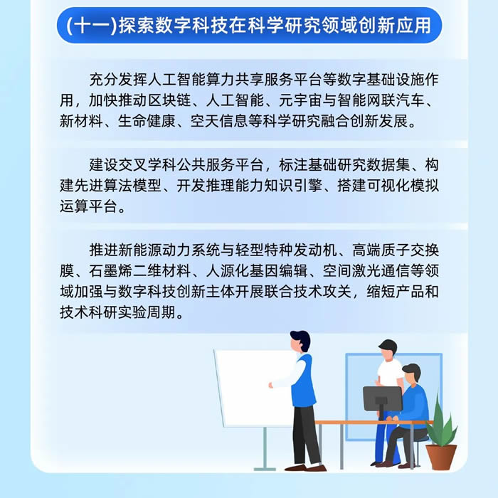 科學研究領域加快推動區塊鏈、人工智能、元宇宙與智能網聯汽車、新材料、生命健康、空天信息等科學研究融合創新發展,建設交叉學科公共服務平臺,推進諸多領域加強與數字科技創新主體開展聯合技術攻關。