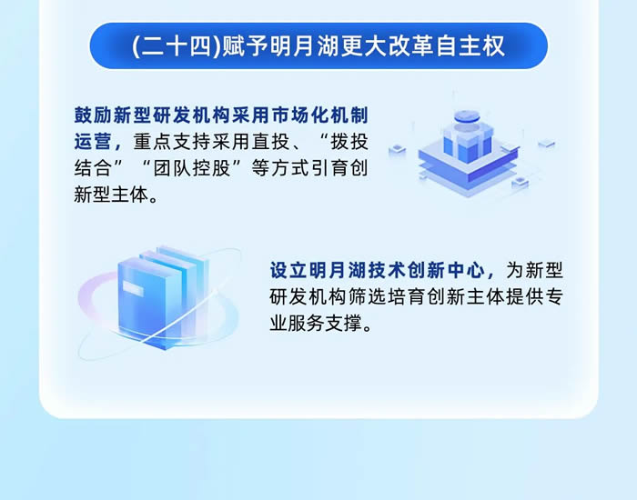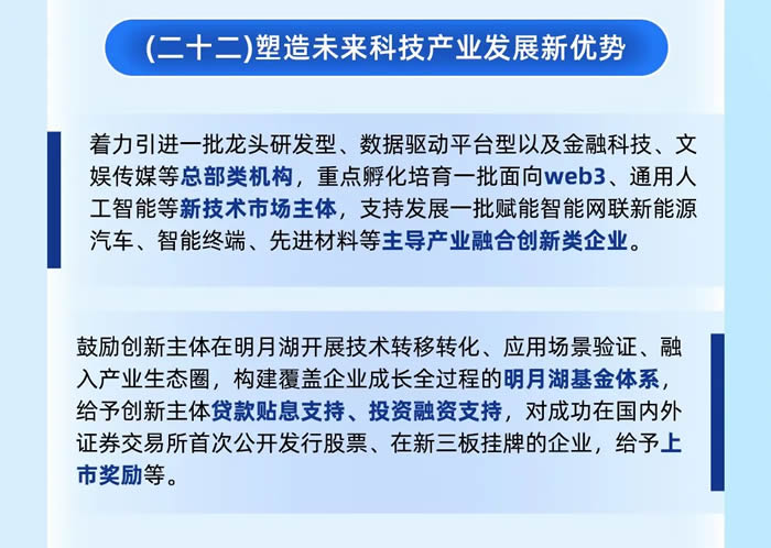 將著力引進一批總部類機構、重點孵化培育一批新技術市場主體、支持發展一批主導產業融合創新類企業,構建覆蓋企業成長全過程的明月湖基金體系,給予創新主體貸款貼息支持、投資融資支持,對符合條件的企業給予上市獎勵等。