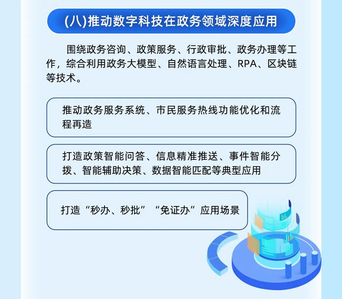 政務領域將推動政務服務系統、市民服務熱線功能優化和流程再造;打造政策智能問答、信息精準推送、事件智能分撥、智能輔助決策、數據智能匹配等典型應用;打造“秒辦、秒批”“免證辦”應用場景。