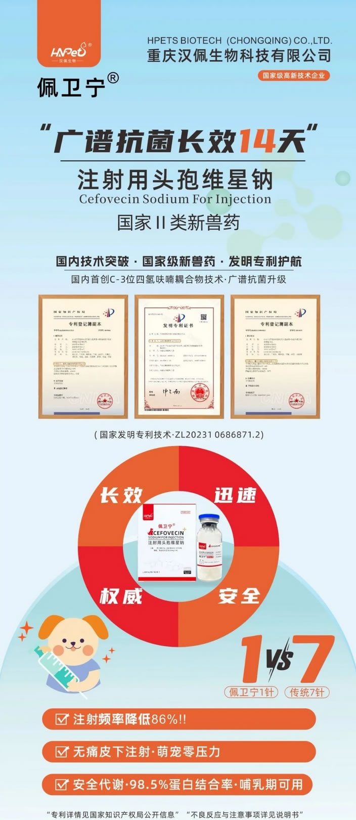 2025年1月,漢佩生物與溫氏大華農合作的“注射用頭孢維星鈉”正式獲得國家農村農業部頒布的國家二類新獸藥證書。漢佩生物自建頭孢維星鈉關鍵原料藥中間體的生產基地,完善產業鏈布局,將極大地降低生產成本,降低終端售價。
