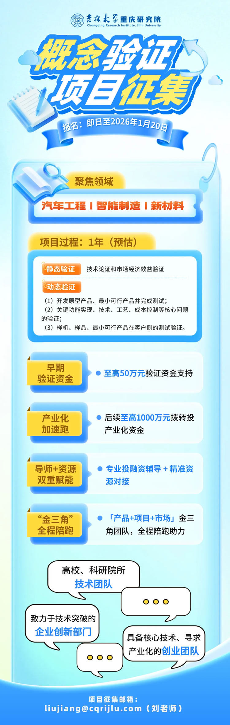 項目征集啟動!瞄準汽車、新材料與智能制造,吉林大學重慶研究院推出“概念驗證+千萬投資”創新加速計劃